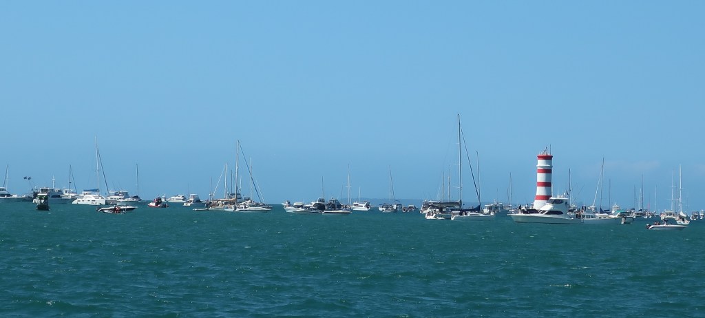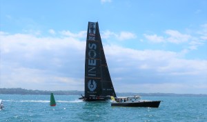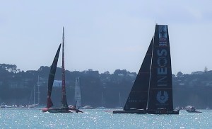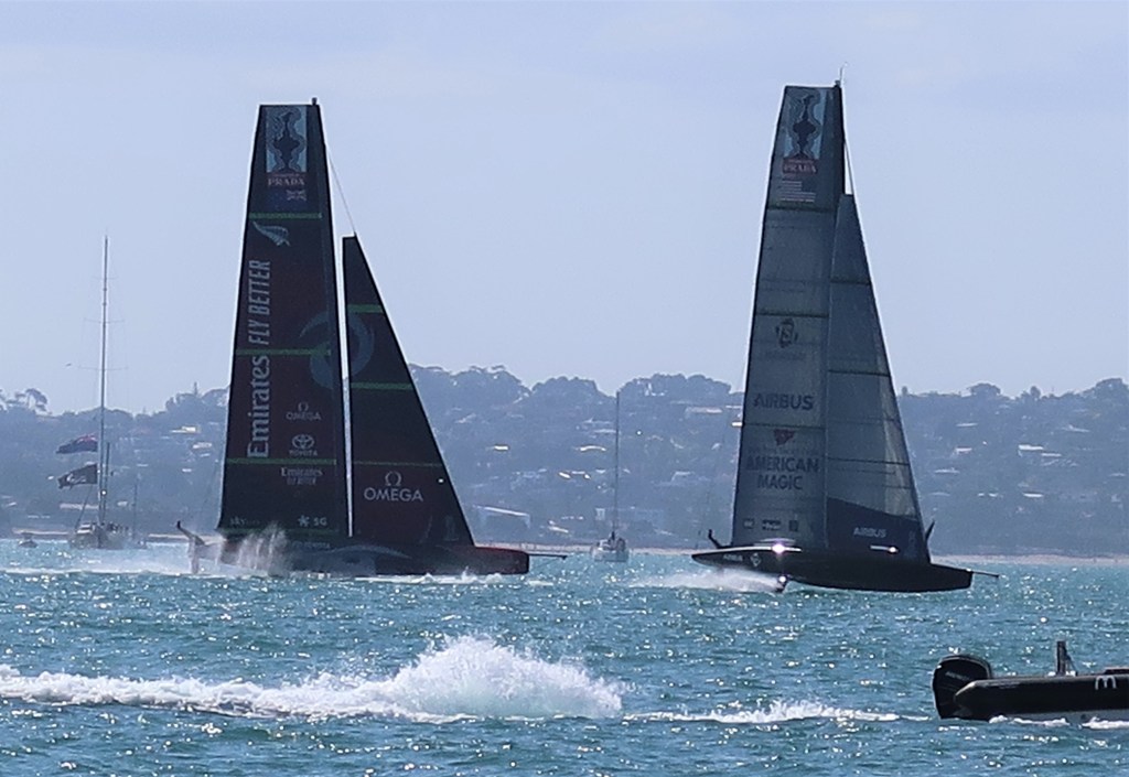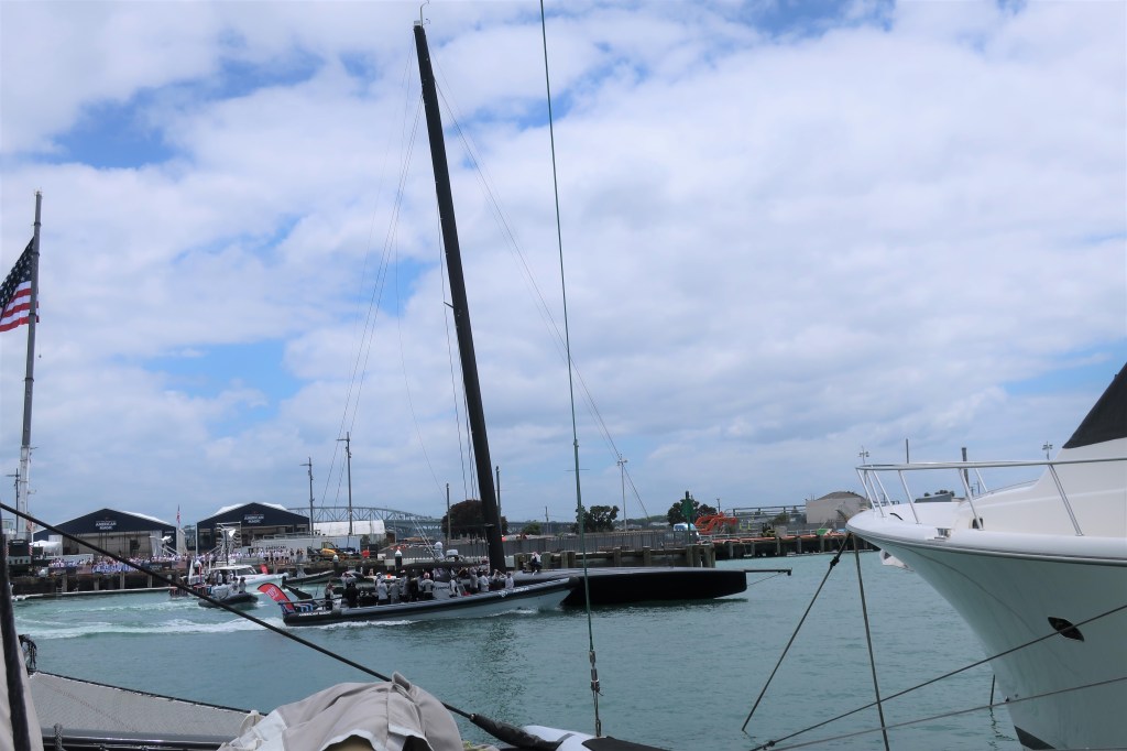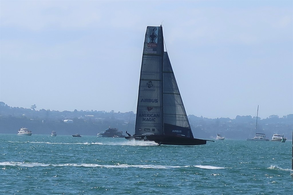 The wind was very light. They started the first race, NZ against Ineos. NZ got around 1 lap on their foils. Ineos struggled to stay on her foils through the first tack (right in front of us) off the line. They sailed in displacement mode the rest of their one lap completed. The wind set down to 5 knots and NZ came off her foils too. Time limit ran out just before NZ was able to get to the finish. No race. Best part of the day was the American Magic fly by on the way back to base.